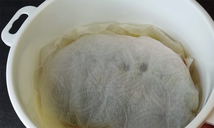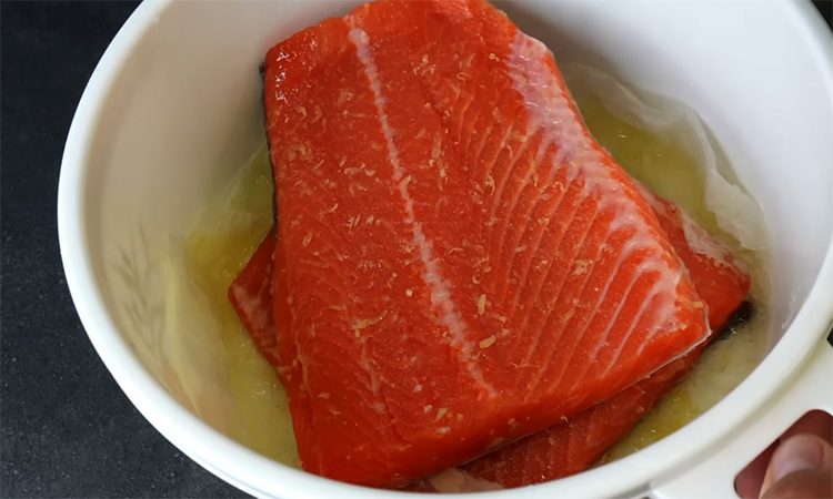 Посыпьте часть смеси соли и сахара, уложите первый кусок рыбы кожей вниз. Посыпьте оставшейся смесью и накройте вторым филе. Сверху положите бумажное полотенце — оно поможет сохранить влагу и удержать специи на поверхности рыбы. Закройте контейнер крышкой и уберите в холодильник на 12–24 часа. Чем дольше рыба стоит, тем плотнее и солонее она становится.