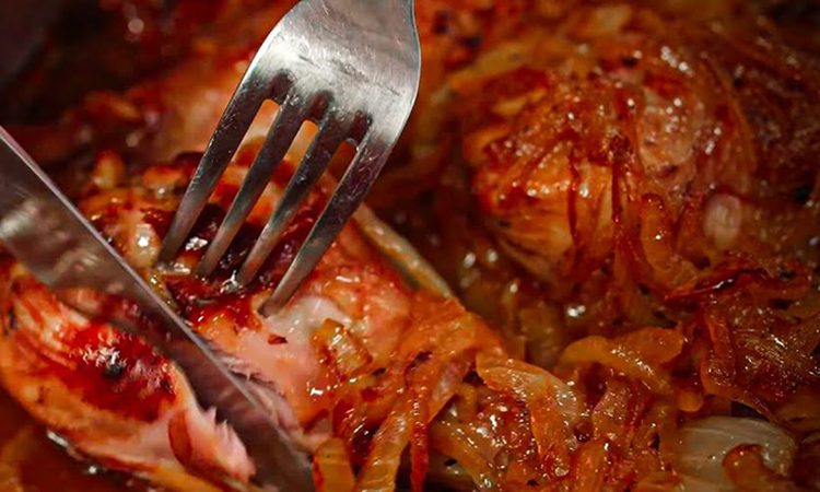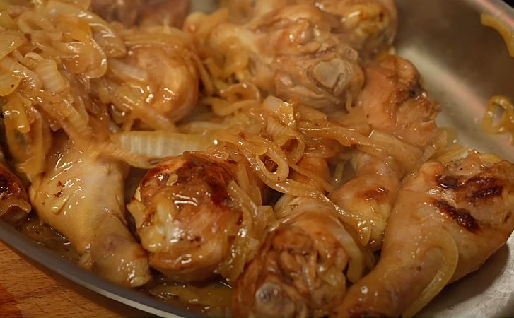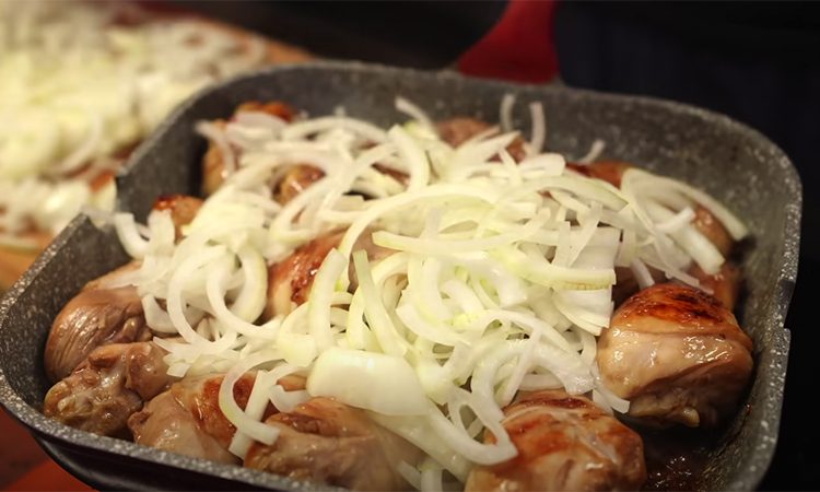 4. Переложите обжаренные голени и лук в форму для запекания. Разогрейте духовку до 180 °C. Запекайте курицу около 15 минут, чтобы мясо полностью приготовилось внутри и стало нежным.