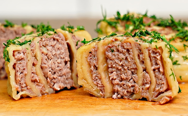 Равномерно распределите фарш по поверхности и сверните пласт рулетом. Край без начинки слегка смажьте водой для склейки. Разделите рулет на две части. Одну часть можно заморозить, вторую нарежьте на порционные кусочки-пельмени.