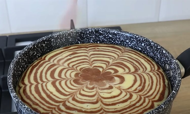 Разделите тесто на две равные части. В одну добавьте просеянное какао и хорошо размешайте. Форму диаметром 20 см застелите бумагой для выпечки. В центр формы поочередно выкладывайте ложкой тесто: четыре ложки светлого, три ложки шоколадного. Таким образом создастся полосатый рисунок.