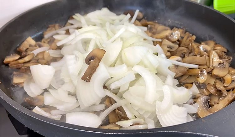 2. Лук нарежьте четвертинками колец или полукольцами. Добавьте лук к грибам на сковороду. Обжаривайте вместе до золотистого цвета и мягкости, периодически помешивая, чтобы лук не подгорел. Готовую смесь выложите на бумажное полотенце, чтобы удалить лишний жир.