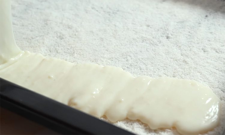 На противень равномерно насыпьте кокосовую стружку, добавьте щепотку соли и вылейте сверху горячий крем. Разровняйте его лопаткой, чтобы слой был гладким и ровным. Накройте поверхность пищевой пленкой в контакт и оставьте остывать до комнатной температуры. Затем уберите в холодильник минимум на 30 минут, чтобы масса полностью застыла и стала плотной. В отдельной миске взбейте охлажденные сливки с чайной ложкой ванильного сахара до мягких пиков.