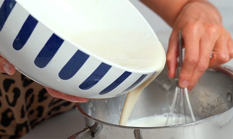 В глубокой миске смешайте муку, сахар и ванильный сахар. Влейте немного горячего молока и размешайте венчиком до гладкой массы без комков. Затем постепенно добавляйте остальное молоко, постоянно помешивая. Перелейте смесь в сотейник и поставьте на средний огонь. Варите, непрерывно помешивая, пока крем не начнет густеть и не появятся первые пузыри кипения. Проварите ещё 1–2 минуты, чтобы мука полностью заварилась. В горячий крем добавьте сливочное масло, размешайте до однородности.