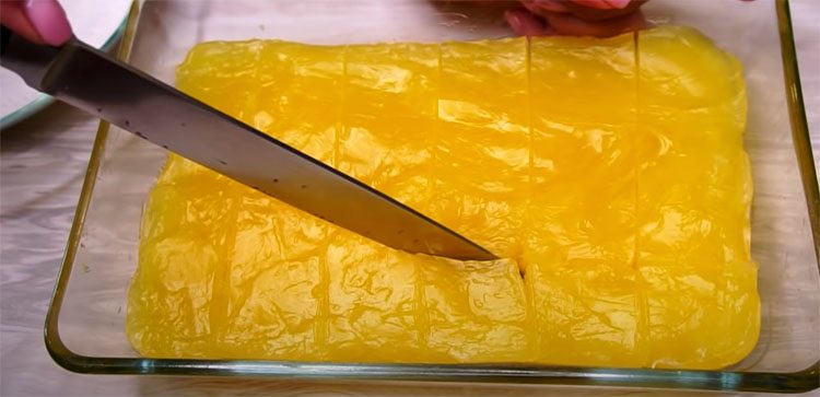 7. После остывания аккуратно выньте лукум из формы и нарежьте на небольшие кусочки (кубики или прямоугольники). Обсыпьте каждый кусочек смесью кукурузного крахмала и сахарной пудры, чтобы сладость не слипалась.