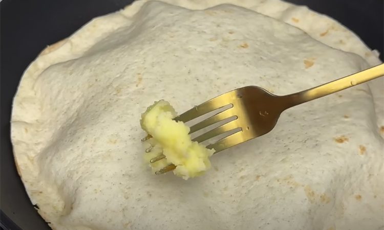 Затем аккуратно переверните, добавьте кусочек сливочного масла и жарьте ещё две минуты, пока лаваш не станет хрустящим и золотистым, а сыр полностью не расплавится. Снимите сковороду с огня, оставьте лаваш под крышкой на минуту, чтобы начинка стабилизировалась.