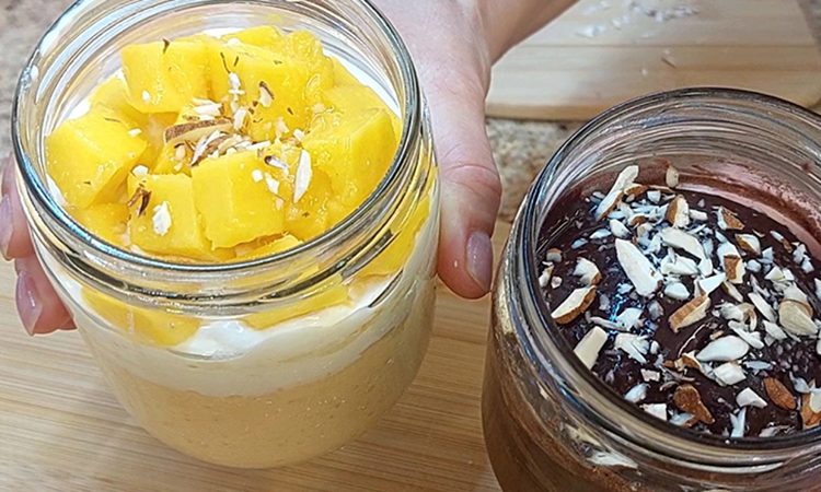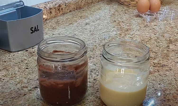 В чистые полулитровые банки разбейте по одному яйцу. Добавьте по щепотке соли и полстоловой ложки сахара. Хорошо перемешайте вилкой или ложкой. В каждую банку налейте по 60 граммов йогурта, можно заменить сметаной, и снова размешайте. В одну банку добавьте 40 граммов рисовой муки и немного ванили, в другую — столько же муки и 10 граммов какао. Всыпьте по грамму разрыхлителя и тщательно перемешайте до однородности.