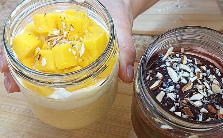 Остудите торты прямо в банках. После этого украсьте по вкусу: на шоколадный положите орешки, на ванильный — сметану, сахар и фрукты.
