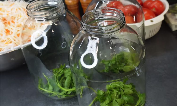 На дно каждой банки положите веточку петрушки, по нескольку горошин черного перца, один лавровый лист и по три очищенных зубчика чеснока. Укладывайте капусту и помидоры слоями: сначала капуста, потом помидоры, и так до верха, немного утрамбовывая, но не плотно. Кипятите воду, залейте ею банки до верха, прикройте крышками и укутайте плотной тканью.
