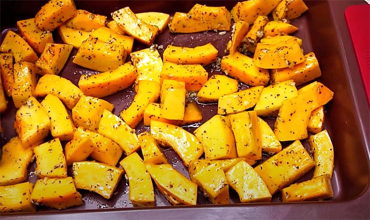 4. Выложите тыкву на противень или в форму одним слоем. Разогрейте духовку до 200 °C. Запекайте 30 минут, время от времени проверяя готовность — кусочки должны стать мягкими, слегка золотистыми и ароматными.