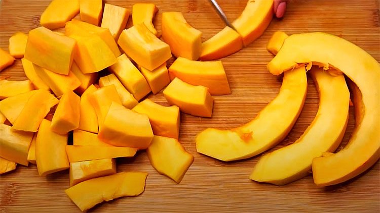 1. Вымойте тыкву, срежьте кожуру и удалите семена. Нарежьте тыкву на крупные дольки (примерно 3–4 см). Каждую дольку разрежьте на более мелкие кусочки примерно одинакового размера, чтобы они запекались равномерно.
