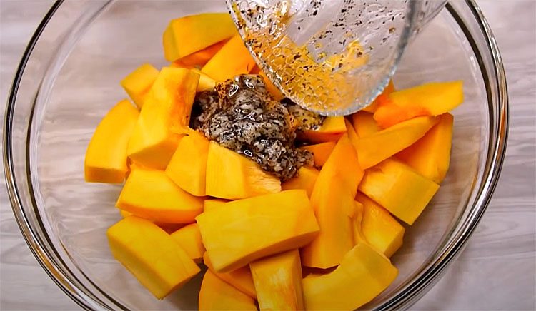 3. В отдельной миске выложите нарезанную тыкву. Залейте маринадом и аккуратно перемешайте лопаткой или руками, чтобы каждый кусочек был покрыт смесью равномерно.