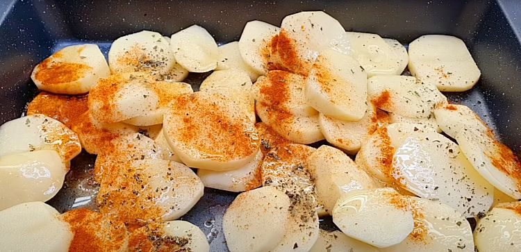 1. Очистите картофель и нарежьте тонкими кружочками (толщина ~3–4 мм), чтобы он равномерно пропекался. Выложите кружочки на противень в один слой (можно слегка пересекать, но не слишком плотно). Посолите, поперчите, добавьте паприку и базилик. Полейте 2 ст. л. оливкового масла и аккуратно перемешайте руками или ложкой, чтобы каждая картофельная долька была покрыта маслом и специями. Отправьте противень в духовку, разогретую до 180 °C, и запекайте 20 минут до полуготовности.