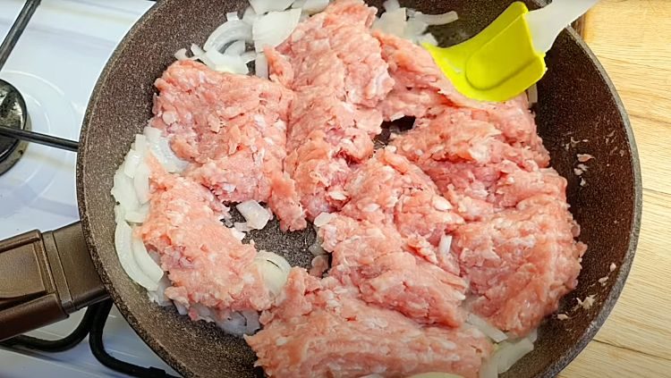 2. Нарежьте четвертинками лук. Разогрейте сковороду с 1 ст. л. оливкового масла. Обжарьте лук на среднем огне 3–4 минуты до прозрачности и легкого золотистого цвета. Добавьте фарш, разломайте его ложкой, чтобы не было крупных комков. Жарьте 7–10 минут, периодически помешивая, пока мясо полностью не изменит цвет. В конце посолите и поперчите по вкусу. Можно добавить щепотку сушеного базилика или паприки для аромата.