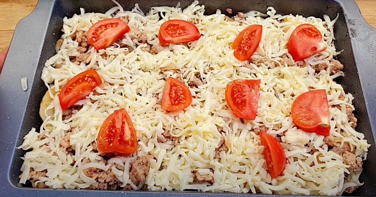 3. Достаньте противень с картофелем из духовки. Равномерно распределите обжаренный фарш с луком поверх картофеля. Натерите сыр на крупной терке и посыпьте им фарш. Нарежьте помидоры кружочками или дольками и выложите поверх сыра.
