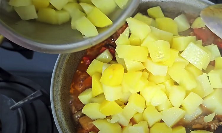Нарежьте баклажаны кубиками примерно сантиметр на сантиметр, посыпьте чайной ложкой соли, перемешайте и оставьте на 15 минут. Слейте выделившийся сок, не промывая овощи. Нарежьте болгарский перец такими же кубиками. Нарежьте лук полукольцами или кубиками, как для поджарки. Очистите и нарежьте помидоры сочными дольками. Нарежьте острый перец мелкими кусочками. Нарежьте картофель кубиками и отварите до состояния, когда он полностью разварится и начнёт распадаться.