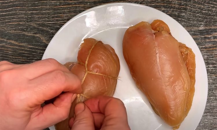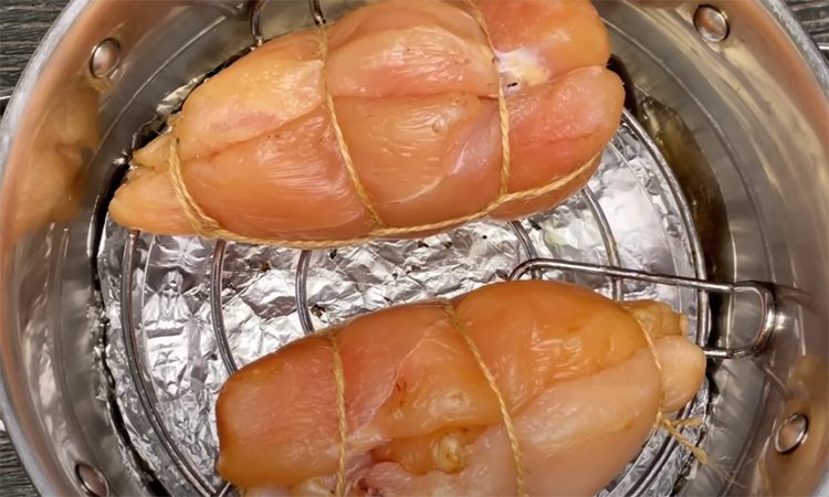 Соедините грудки попарно и перевяжите бечёвкой. На дно кастрюли положите кусок фольги, высыпьте на него щепу ольхи и накройте вторым слоем фольги, в котором сделайте несколько проколов зубочисткой. Сверху установите решетку или металлическое кольцо для выпечки, чтобы мясо не касалось дна.