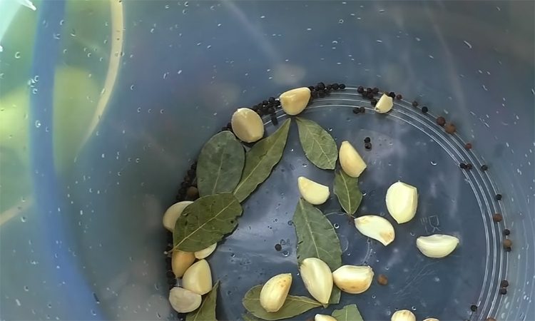 Прижмите грузом или тарелкой, накройте крышкой и оставьте при комнатной температуре на сутки, затем уберите в прохладное место или погреб. Проверяйте рассол и доливайте при необходимости, следите, чтобы верхний слой оставался под жидкостью и не покрывался плесенью.