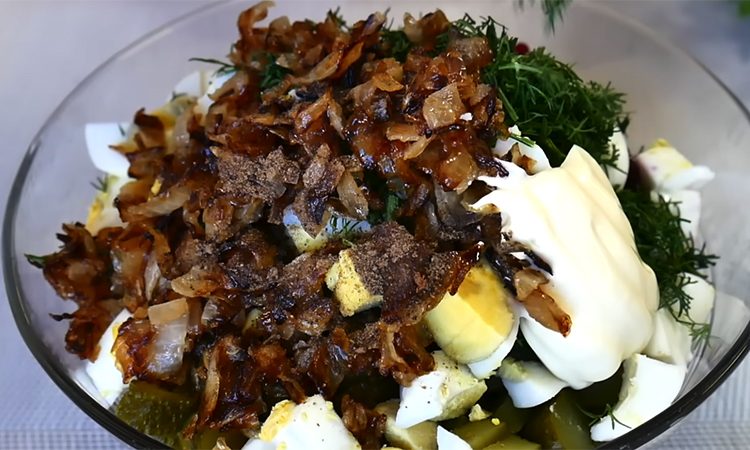 Укроп промойте, обсушите и мелко порубите, затем аккуратно вмешайте в салат. Лук очистите и нарежьте как можно мельче, прогрейте сковороду, влейте немного масла и томите лук на среднем огне около десяти минут, пока он не станет золотистым и мягким. Переложите лук в салат, добавьте перец и по вкусу немного соли.