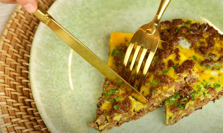 4. Убавьте огонь до слабого и аккуратно влейте яичную смесь в сковороду с фаршем, равномерно распределяя ее по поверхности. Не перемешивайте. Накройте крышкой и готовьте 7–8 минут на медленном огне, чтобы яйца полностью схватились, а внутри не осталось жидкости. За это время блюдо станет плотным, но останется сочным благодаря фаршу.