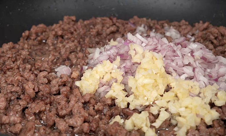 2. Пока фарш обжаривается, мелко нарежьте лук-шалот и измельчите чеснок. Добавьте их в сковороду, перемешайте с фаршем и готовьте еще 2–3 минуты, пока лук не станет мягким и прозрачным, а чеснок не отдаст свой аромат. Посолите, поперчите и влейте бальзамический уксус — он придаст блюду легкую кислинку и карамельный оттенок вкуса. Готовьте еще минуту, чтобы уксус выпарился.