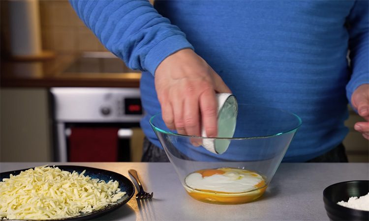 Натрите оба вида сыра на крупной тёрке и перемешайте. В отдельной миске соедините яйца, кефир, соль и сахар, перемешайте до однородности. Добавьте сыр и постепенно подсыпайте муку, пока масса не станет густой, но мягкой.