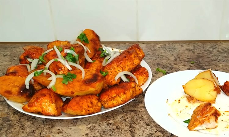 В холода шашлык на улице уже не пожарить, но мясо с тем же характерным вкусом можно приготовить и дома, прямо в духовке. Тот самый дымный аромат придаст ему особый соус-маринад, даже куриная грудка по этому рецепту получится невероятно сочной и аппетитной. Кроме того, тут все готовится сразу с картофелем — полноценный ужин можно подать на стол всего за 30-40 минут.