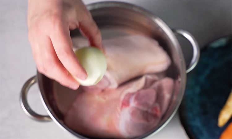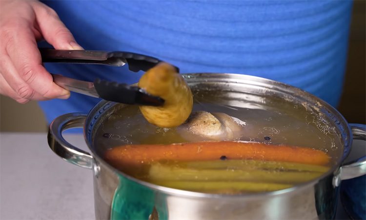 Хорошенько промойте и опалите свиную рульку. Сразу же отправьте голень в кипящую воду, чтобы она полностью покрыла мясо. Добавьте к мясу целую луковицу, корень петрушки, морковь и пару стеблей сельдерея, а также лавровые листья и черный душистый перец горошком. Обязательно подсолите воду, добавив 1,5 столовой ложки соли на 2 литра. Доведите воду до кипения, уменьшите температуру до минимума, чтобы процесс шел легко, и варите рульку под крышкой полтора-два часа, время от времени снимая пену.