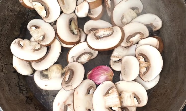 Грибы нарежьте толстыми слайсами, раскалите сковороду с чесноком и обжарьте шампиньоны до золотистого оттенка, подсолите и поперчите, вливайте несколько капель воды, чтобы собрать соус со дна. Приготовьте морне: растопите сливочное масло, вмешайте муку и, постепенно вливая холодное молоко, доведите смесь до густого бешамеля. Добавьте каенский перец, соль с учетом солености сыров, снимите с огня и вмешайте тертые конте, эторки и пармезан.