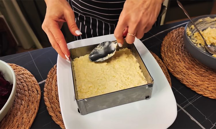 Перемешайте до однородности. Получится густая, кремообразная масса, которая хорошо сочетается со свеклой. Салат удобно собирать в форме с бортами. Установите форму на плоское блюдо, первым слоем выложите треть свеклы, разровняйте. Сверху распределите половину сырной начинки, снова слой свеклы, затем оставшуюся часть сырной массы и завершите третью порцией свеклы. Каждый слой слегка прижимайте ложкой, чтобы салат получился ровным и плотным.