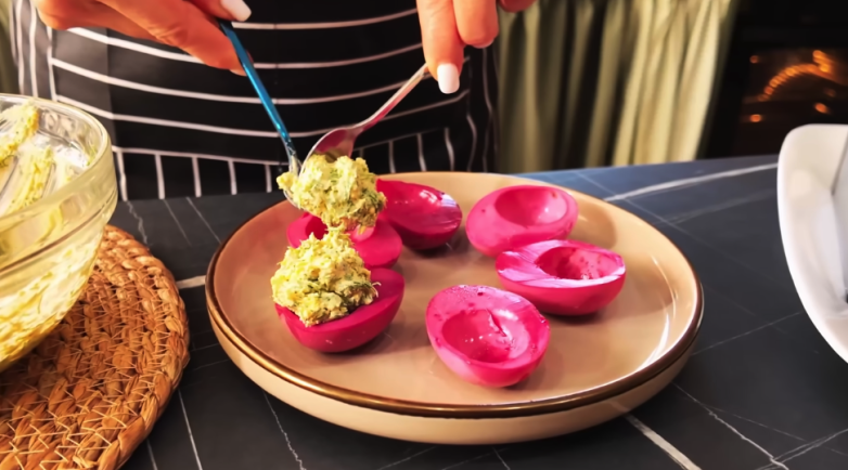 Оставьте собранный салат настояться 15–20 минут. Пока он охлаждается, займитесь яйцами. Отварите их вкрутую, очистите и разрежьте пополам. Белки аккуратно окуните в свекольный сок на несколько секунд, чтобы они стали розовыми. Затем обсушите на бумажном полотенце. Желтки перетрите с мягким сливочным маслом, добавьте немного соли, перца и мелко нарезанный укроп. Перемешайте до кремовой текстуры.