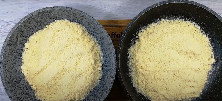 2. Переложите смесь на сухую сковороду и обжаривайте на среднем огне, постоянно помешивая, до золотистого цвета (примерно 8–10 минут). Важно не передержать — следите, чтобы не подгорело. Готовую крошку выложите на тарелку или пергамент и полностью остудите.