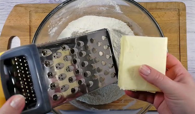 1. В глубокой миске соедините муку и сахар. Натрите на крупной терке мягкое сливочное масло, добавьте к муке и сахару. Перетирайте руками или ложкой до состояния влажной крошки (как мокрый песок).