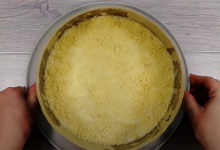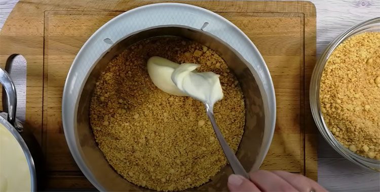 6. Выложите дно и бортики формы (разъёмной или обычной) пищевой плёнкой — так будет проще достать торт. Выложите первый слой песочной крошки (примерно 1/4 от всего объёма) и аккуратно разровняйте. Этот слой должен быть максимально ровным — он станет основой торта. Затем распределите часть крема (примерно 1/3). Повторите слоение: крошка → крем → крошка → крем.