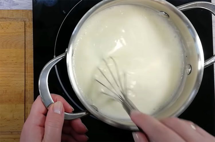 4. Поставьте кастрюлю на слабый огонь. Постоянно помешивайте крем венчиком или силиконовой лопаткой, особенно по дну, чтобы не образовались комки. Варите до загустения (примерно 6–8 минут). Масса должна стать похожей на заварной крем.