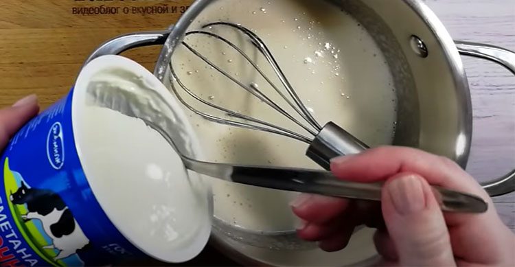 3. В кастрюле (лучше с толстым дном) взбейте яйца с сахаром и ванильным сахаром венчиком до однородности. Постепенно введите крахмал, хорошо размешайте. Затем добавьте сметану и снова перемешайте до однородной массы.