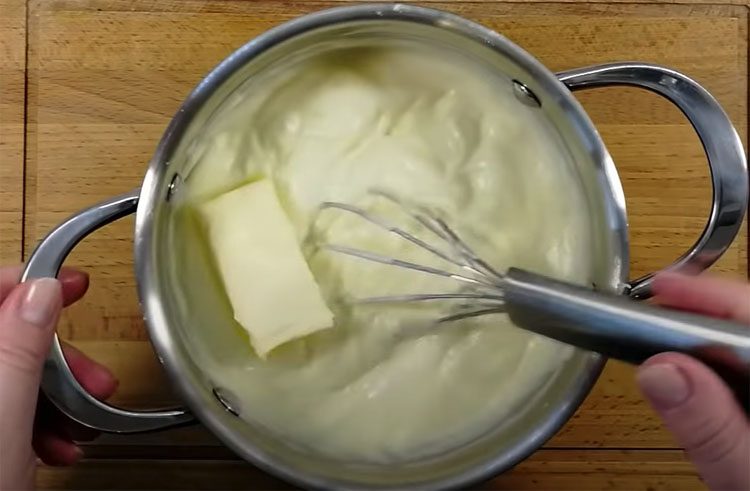 5. Снимите с огня и сразу вмешайте сливочное масло. Перемешивайте до полного растворения и гладкой консистенции. Оставьте остывать до комнатной температуры.
