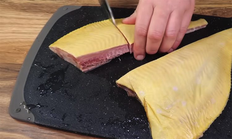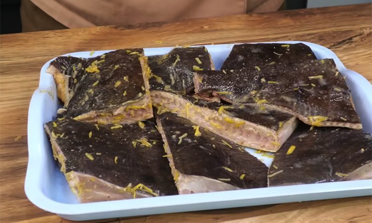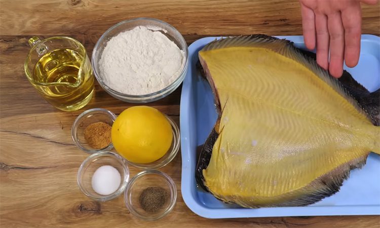 Рыбу тщательно промойте, удалите плавники, хвост и внутренности. Камбалу разрежьте по хребту на две половины, затем каждую разделите еще на две части. Если попалась икра, оставьте ее внутри — она придаст блюду дополнительную сочность. Рыбу обсушите бумажными полотенцами. Приготовьте маринад: снимите с половины лимона только желтую часть цедры, добавьте сок, соль, перец и сухой чеснок.