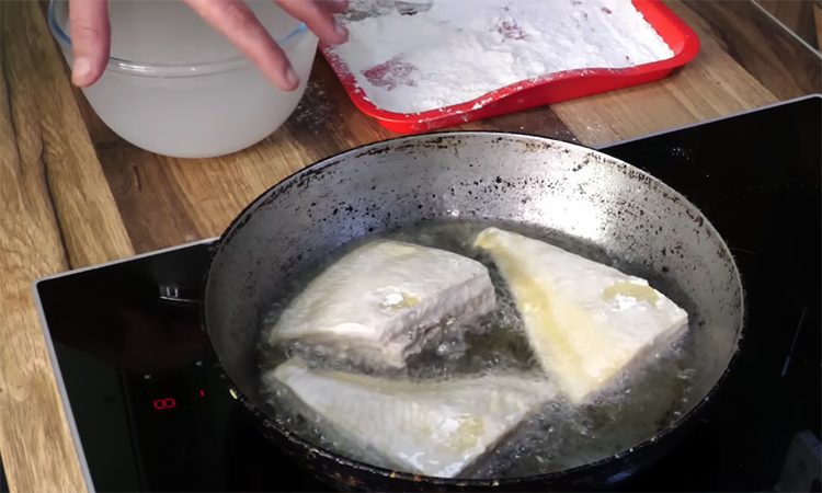 При желании можно добавить в муку немного соли. Каждый кусочек камбалы обваляйте в муке, стряхните излишки, затем быстро окуните в ледяную воду и сразу же выложите на раскаленное масло. Обжаривайте рыбу на среднем огне по 1,5–2 минуты с каждой стороны до появления золотистой корки.