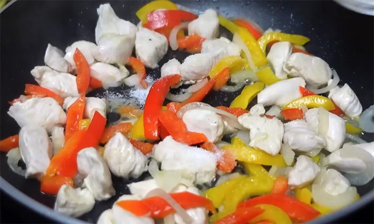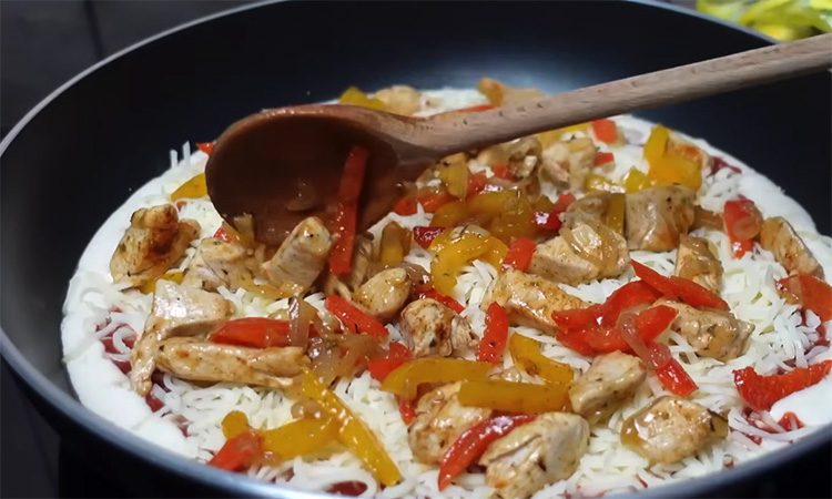 Накройте крышкой и готовьте на очень медленном огне около 15–20 минут, чтобы тесто полностью схватилось и нижняя часть слегка подрумянилась. Пока тесто готовится, нарежьте курицу и овощи небольшими кусочками, при необходимости слегка обжарьте их заранее. После того как основа почти готова, равномерно распределите томатный соус, добавьте нарезанные овощи и курицу, посыпьте паприкой и орегано, при желании слегка подсолите и поперчите.