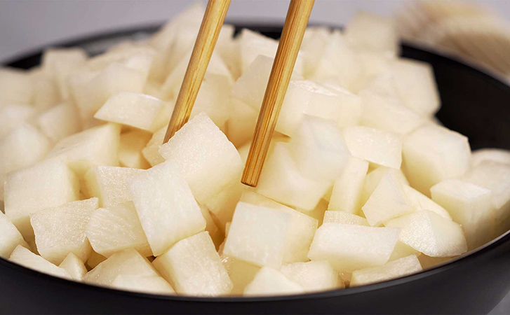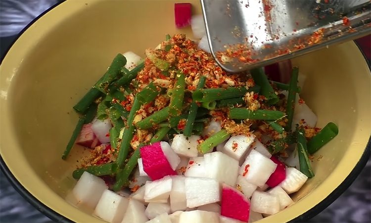 Редьку нарежьте кубиками размером около 1–2 см и сложи в большую миску. Добавьте соль и сахар, тщательно перемешайте и оставьте на 30–40 минут, чтобы овощ пустил сок. Каждые 10 минут перемешивайте, чтобы кристаллы равномерно распределились. Когда редька выделит достаточно жидкости, слейте лишний сок, но оставьте немного для последующего шага. Чеснок очистите и измельчите.