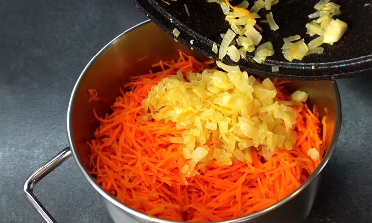 Отварите курицу в подсоленной воде и дайте полностью остыть. Очистите морковь, натрите ее на терке для корейской моркови, обжарьте на сковороде в небольшом количестве масла примерно четыре минуты, не доводя до полной мягкости, а лишь слегка притомите, затем переложите в миску. В той же сковороде добавьте немного масла, порежьте лук кубиками и обжарьте до полупрозрачного состояния.
