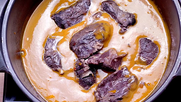 4. Выньте мясо, измельчите оставшиеся ингредиенты в блендере до густого соуса, затем соедините с мясом обратно в кастрюле.