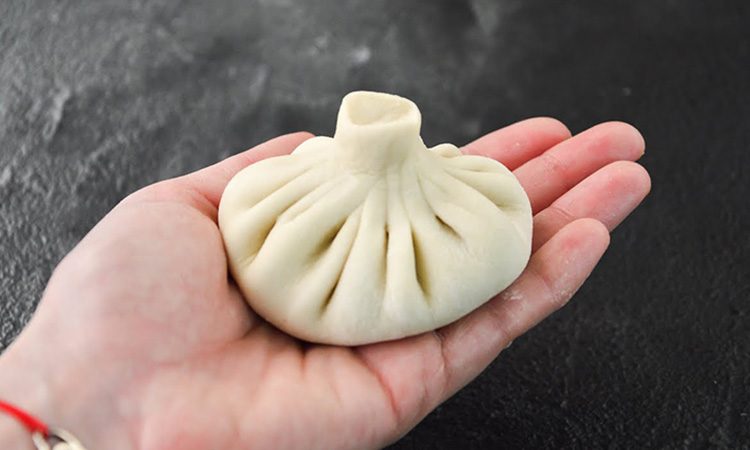 Раскатайте каждый колобок в кружок диаметром 18–20 см и толщиной 1–2 мм. В центр каждого кружка выложите примерно 70 г фарша. Соберите края теста к верху, формируя складки, собирая их на большой палец одной руки, прокручивая по кругу.