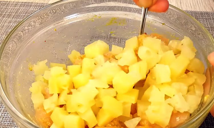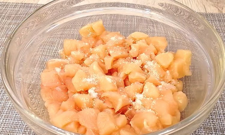 Начните с подготовки куриного филе, разрежьте его вдоль на два тонких куска, затем разделите на полосы и нарежьте маленькими равномерными кубиками, чтобы смесь проготовилась быстро и оставалась нежной. Переложите филе в миску, всыпьте соль, черный молотый перец, добавьте сухой чеснок, кари, положите ложку горчицы и влейте растительное масло, затем тщательно перемешайте, чтобы кусочки равномерно покрылись приправами и маслом.