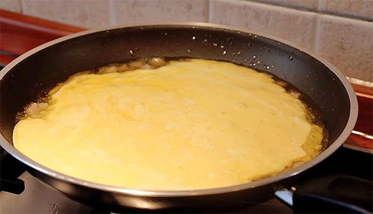 5. Вылейте яично-сливочную смесь на сковороду с обжаренной грудинкой и готовьте на среднем огне 3–4 минуты, постоянно помешивая, чтобы масса слегка загустела, но не превратилась в омлет. Консистенция должна быть нежной и кремовой, чтобы начинка была сочной.