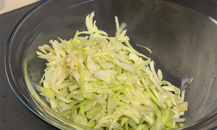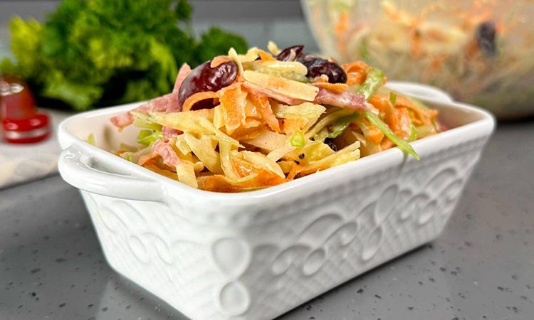 Охладите салат 5–10 минут или подавайте сразу, пока капуста максимально хрустит.
