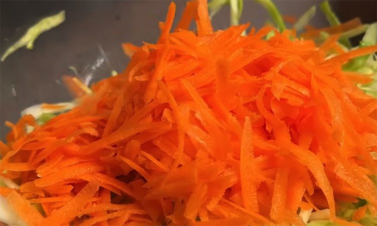 Очистите капусту от плотных верхних листьев, разрежьте кочан на части и нашинкуйте тонкой соломкой. Переложите капусту в глубокую миску, присыпьте щепоткой соли и слегка помните руками, чтобы она стала мягче и уменьшилась в объеме, но сохранила хруст. Очистите морковь, подрежьте кончики и натрите на крупной терке или на терке для корейской моркови.