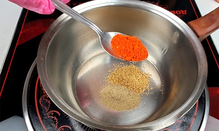 Капусту аккуратно перемешайте еще раз, слегка отожмите и слейте выделившуюся жидкость, не пересушивая массу: задача убрать лишнюю воду, но сохранить хруст. Верните капусту в миску и добавьте свеклу, перемешайте, стараясь распределить ее так, чтобы сок начал равномерно подкрашивать капусту. Подготовьте ароматное масло. Поставьте сковороду на средний огонь, влейте растительное масло, прогрейте и всыпьте паприку.