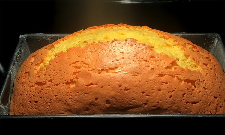 Готовность проверяйте деревянной шпажкой — она должна выходить сухой. Остывший кекс выложите из формы, посыпьте сахарной пудрой. При разрезе он ярко-желтый, ароматный, с лёгким лимонным вкусом. Такой кекс долго не черствеет и особенно хорош с чашкой горячего чая.