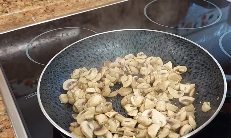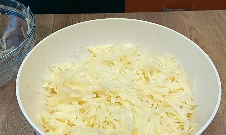 Картофель очистите, натрите на крупной терке прямо в миску с водой и оставьте постоять, чтобы вода вытянула часть крахмала. Грибы нарежьте небольшими кусочками сразу в сухую скородку, поставьте на максимальный нагрев и выпарите жидкость, периодически помешивая. Когда лишняя влага ушла, введите немного растительного масла, присолите, добавьте перец и молотый сушеный белый гриб, перемешайте и обжарьте пару минут до выраженного аромата, затем переложите грибы на тарелку.